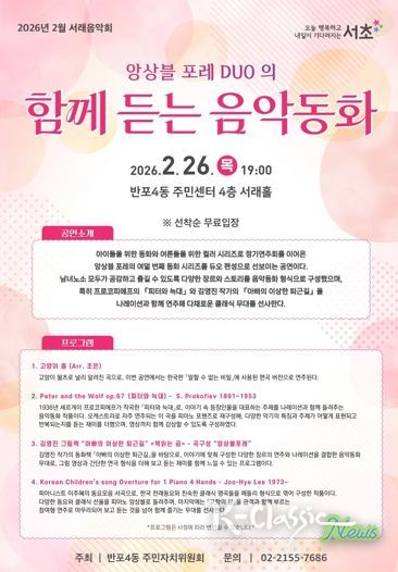 K-Classic News 기자 | 서울 서초구는 26일 오후 7시, 반포4동주민센터 4층 서래아트홀에서 2월 서래음악회 ‘앙상블 포레 DUO의 함께 듣는 음악동화‘를 개최한다고 밝혔다.