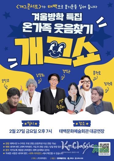 K-Classic News 기자 | 태백시는 겨울방학을 맞아 오는 2월 27일 오후 7시 태백문화예술회관 대공연장에서 '온가족 웃음찾기 개그쇼'를 개최한다고 밝혔다.