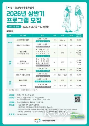 K-Classic News 기자 | 이천시 청소년생활문화센터가 청소년과 지역주민의 건강한 생활문화 형성과 역량 강화를 위해 ‘2026년 상반기 프로그램’을 운영하고 수강생을 모집한다고 밝혔다.