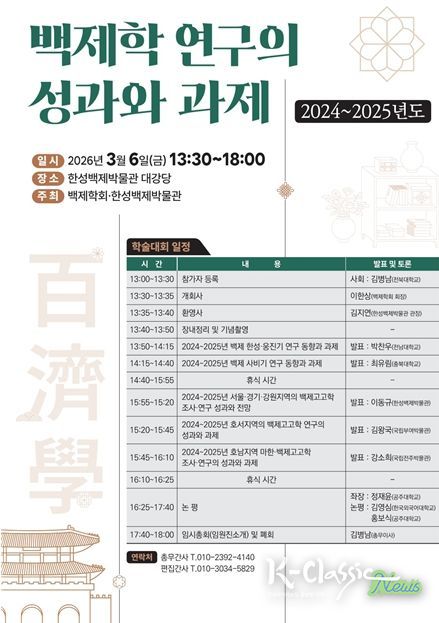 K-Classic News 기자 | 한성백제박물관(관장 김지연)은 백제학회(회장 이한상)와 공동으로 3월 6일 오후 1시 30분부터 한성백제박물관 대강당에서 최근 2년간의 백제학 연구 성과를 바탕으로 학술회의를 개최한다. 관련 분야 연구자뿐 아니라 백제사와 고고학에 관심 있는 시민 누구나 참여할 수 있다.