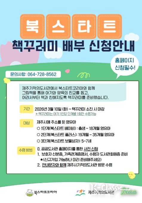 K-Classic News 기자 | 제주기적의도서관은 영유아의 평생 독서 습관 형성을 위해 북스타트 사업 ‘내 생애 첫 선물, 책꾸러미’ 배부 대상을 확대한다.