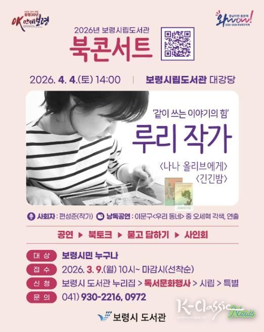 K-Classic News 기자 | 보령시는 4월 4일 토요일 오후 2시 보령시립도서관 대강당에서 베스트셀러 『긴긴밤』의 저자 루리 작가를 초청해 북콘서트를 개최한다고 밝혔다.