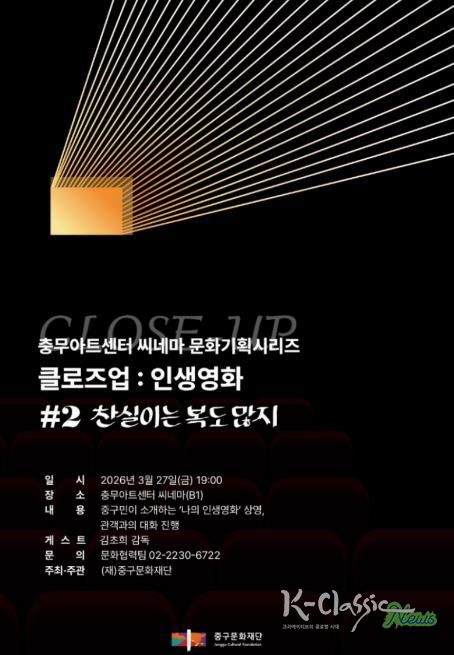 K-Classic News 기자 | 서울 중구문화재단은 오는 3월 27일, 충무아트센터 씨네마에서 중구민이 직접 ‘나의 인생영화’를 소개하고 영화감독과 함께 대화를 나누는 '클로즈업 : 인생영화'를 개최한다.