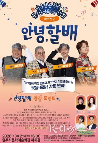 영주시문화예술회관 관계자는 “이번 ‘안녕, 할배’는 부모님을 위한 최고의 효도 공연이자 온 가족이 함께 즐길 수 있는 주말 나들이가 될 것”이라며 “따뜻한 봄날, 까치홀에서 마음껏 웃으며 일상의 스트레스를 날려버리시길 바란다”고 전했다.