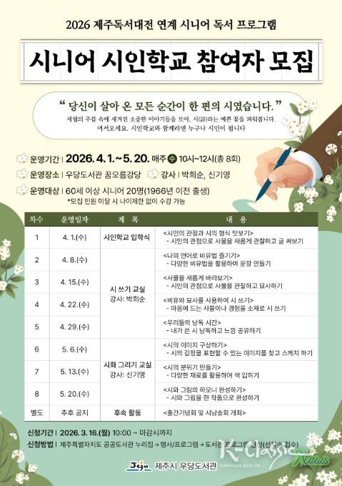 K-Classic News 기자 | 제주시 우당도서관은 2026 제주독서대전과 연계해 시민의 삶과 경험을 문학적 가치로 재발견하는 특별 프로그램인 ‘시니어 시인학교’ 참여자를 모집한다.