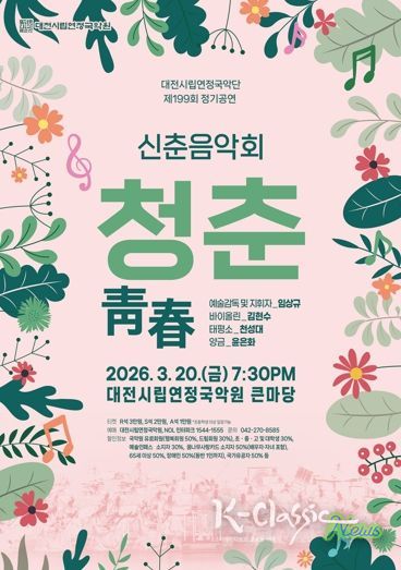 K-Classic News 기자 | 대전시립연정국악단은 20일 오후 7시 30분, 국악원 큰마당에서 제199회 정기공연 신춘음악회 ‘청춘(靑春)’을 개최한다.