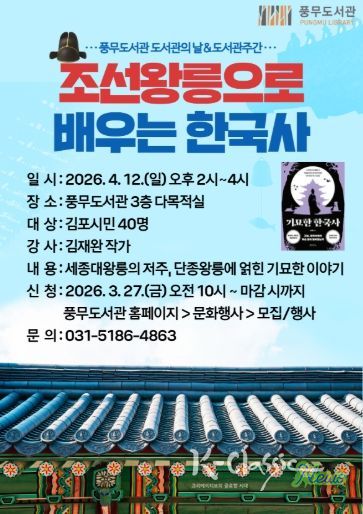 K-Classic News 기자 | 김포시 풍무도서관은 오는 4월 12일 오후 2시부터 인문학 프로그램 ‘조선왕릉으로 배우는 한국사’를 운영한다.
