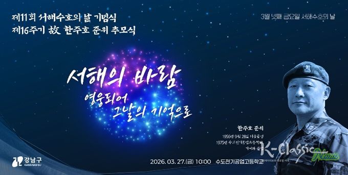 K-Classic News 기자 | 꿈이 모이는 도시, 미래를 그리는 강남구가 3월 27일 수도전기공업고등학교에서 ‘제11회 서해수호의 날 기념식’과 ‘제16주기 故 한주호 준위 추모식’을 연다. 주민, 학생, 보훈단체, 군 관계자 등 500여 명이 함께할 예정이다.