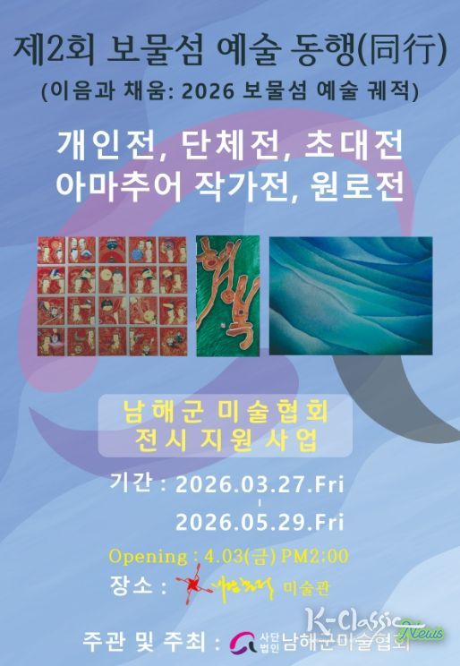 K-Classic News 기자 | (사)남해군미술협회는 오는 3월 27일부터 5월 29일까지 바람흔적 미술관에서 지역 예술인들의 창작 활동을 지원하고 군민들에게 풍성한 볼거리를 제공하기 위해 ‘제2회 보물섬 예술 동행’ 전시 지원사업을 개최한다.