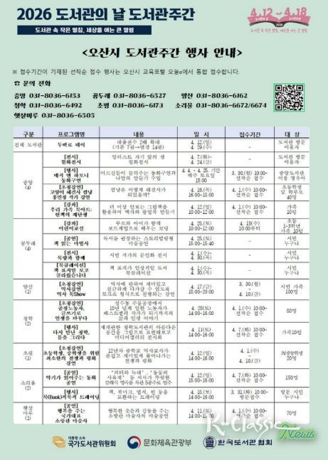 K-Classic News 기자 | 오산시는 2026년 도서관의 날(4월 12일)과 도서관주간(4월 12일~4월 18일)을 맞아 시민 누구나 참여할 수 있는 다양한 독서문화 행사를 운영한다고 밝혔다.