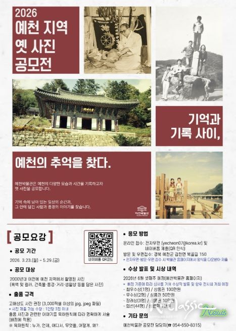 K-Classic News 기자 | 예천박물관은 지역의 역사와 생활상을 담은 기록을 수집·공유하기 위한 ‘2026 예천 지역 옛 사진 공모전 – 기억과 기록 사이, 예천의 추억을 찾다’ 공모전을 5월 29일까지 개최한다.