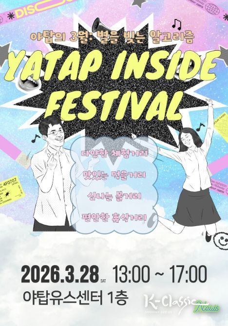 K-Classic News 기자 | 성남시청소년청년재단 야탑유스센터는 오는 3월 28일 오후 1시부터 야탑유스센터 1층 로비와 광장에서 청소년과 청년, 지역주민이 함께 즐기는 체험형 축제 ‘2026 [YATAP INSIDE - 안에 다 있다] 야탑의 3월: 별을 빚는 알고리즘’을 개최한다.
