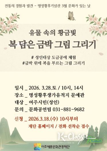 K-Classic News 기자 | 여주세종문화관광재단은 오는 3월 28일, 명성황후기념관 3월 문화가 있는 날 프로그램으로 '유물 속의 황금빛, 복 담은 금박 그림 그리기'를 진행한다.
