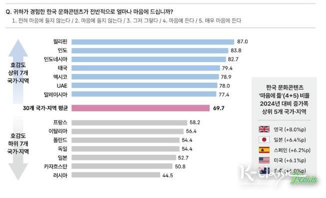 이번 조사 결과, 응답자의 10명 중 7명(69.7%)이 한국 문화콘텐츠에 대해 호감을 나타냈으며, 한류가 한국 제품 및 서비스 구매에도 긍정적인 영향을 미치는 것으로 확인돼 ‘케이-컬처’의 지속적인 인기와 파급력을 입증했다. 특히, 필리핀(87.0%), 인도(83.8%), 인니(82.7%), 태국(79.4%) 등 동남아시아 지역의 선호가 높게 나타났으며, 그간 호감도가 비교적 낮았던 미주·유럽 국가들의 선호도 작년 대비 증가하는 양상을 보였다.