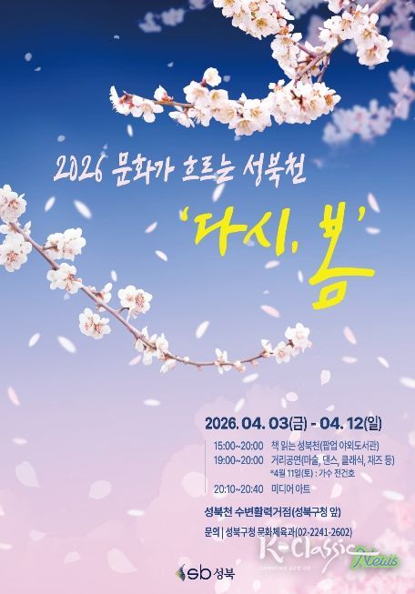 K-Classic News 기자 | 서울 성북구가 주민참여형 복합문화행사인 문화가 흐르는 성북천 '다시, 봄'과 팝업 야외도서관 '책읽는 성북천'을 오는 4월 3일부터 12일까지 10일간 성북구청 앞 성북천 수변활력거점 일대에서 운영한다.
