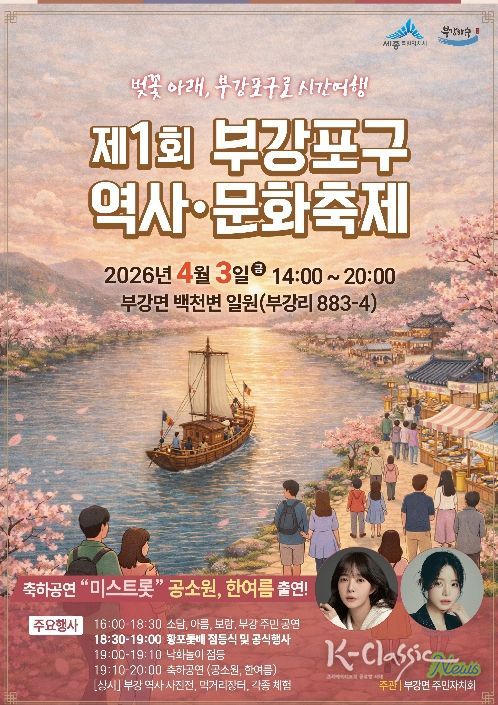 K-Classic News 기자 | 세종특별자치시 부강면 주민자치회가 오는 3일 오후 2시 부강면 부강리 백천변 일원에서 ‘제1회 부강포구 역사·문화 축제’를 개최한다.