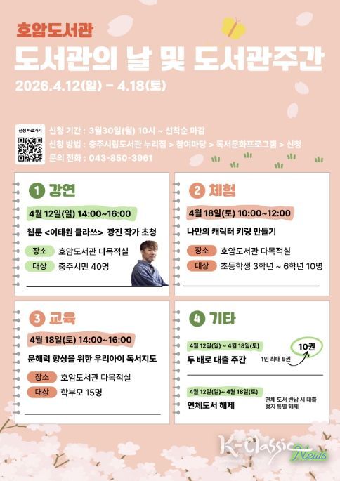 K-Classic News 기자 | 충주시 호암도서관은 제4회 ‘도서관의 날’과 제62회 ‘도서관주간’을 맞아 4월 12일부터 18일까지 7일간 다채로운 독서문화 행사를 운영한다고 2일 밝혔다.