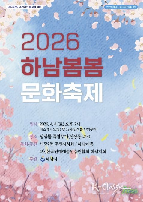 K-Classic News 기자 | ‘2026 하남 봄봄 문화축제’가 오는 4월 4일 당정뜰 일원에서 열린다. 이번 축제는 신장2동 주민자치회와 (사)한국연예예술인총연합회 하남지회가 공동 주최·주관하고 하남시가 후원한다.