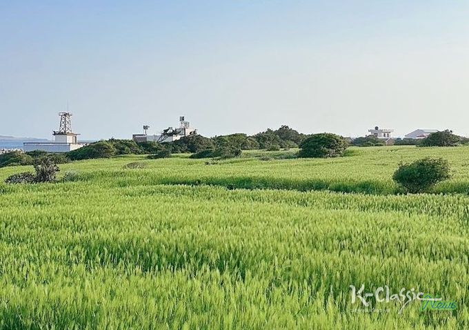 청보리밭 사이로 한라산, 산방산, 송악산 등 주변 경관을 감상하는 것도 빼놓을 수 없는 장관을 이룬다.