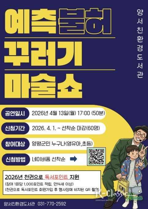 대표 프로그램인 ‘예측불허 꾸러기 마술쇼’는 오는 4월 13일 오후 5시에 개최된다. ‘매직유랑단’이 진행하는 이번 공연은 관객 참여형 마술 체험으로 구성돼 어린이들의 상상력을 자극할 것으로 기대된다. 모집 대상은 보호자를 동반한 관내 영유아 및 초등학생이며, 4월 1일부터 온라인 신청(네이버 폼)을 통해 선착순 60명을 모집한다. 참여자에게는 ‘천권으로 독서 포인트’ 1,000점이 적립된다.