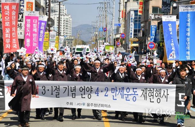 K-Classic News 기자 | 울주청년회의소가 2일 언양읍 행정복지센터와 언양 시가지 일대에서 제107주년 기념 언양 4.2 만세운동 재현행사를 개최했다.