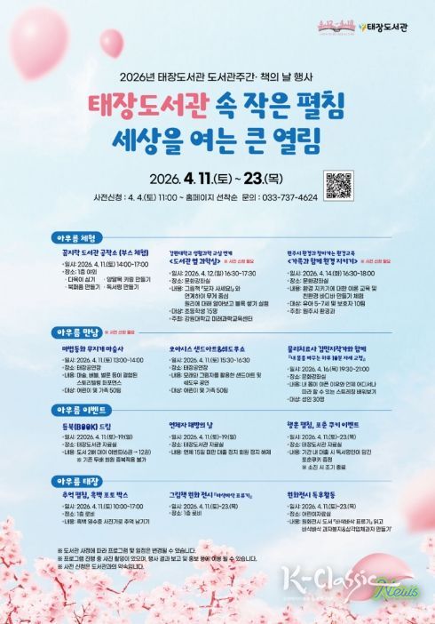 K-Classic News 기자 | 원주시 태장도서관은 도서관 주간 및 책의 날을 맞이해 오는 11일부터 23일까지 ‘태장도서관 속 작은 펼침, 세상을 여는 큰 열림’을 주제로 다양한 행사를 개최한다.
