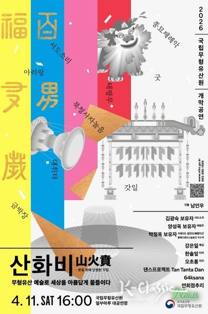 K-Classic News 기자 | 국가유산청 국립무형유산원(원장 박판용)은 '2026년 개막공연 산화비(山火賁)'(부제: 무형유산 예술로 세상을 아름답게 물들이다)를 오는 4월 11일 오후 4시, 국립무형유산원 얼쑤마루 대공연장(전북 전주시)에서 개최한다.