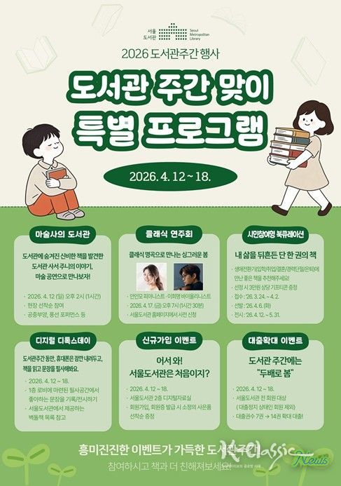 K-Classic News 기자 | 서울도서관은 4월 12일부터 18일까지 ‘도서관주간’을 맞아 시민들의 독서 생활화를 위한 다채로운 문화행사를 마련한다고 밝혔다. 마술쇼와 연주회 등 특별 프로그램을 비롯해 남녀노소 누구나 즐길 수 있는 이벤트와 참여 프로그램이 운영될 예정이다.