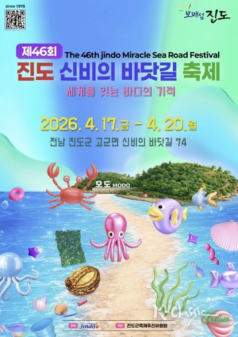 K-Classic News 기자 | 진도군은 ‘세계를 잇는 바다의 기적’을 주제로 한 '제46회 진도 신비의 바닷길 축제'를 오는 17일부터 20일까지 4일간, 고군면 신비의 바닷길 일원에서 개최한다.