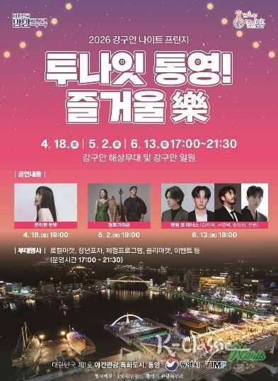 K-Classic News 기자 | 통영시는 오는 18일 강구안 해상무대 및 강구안 일원에서 '2026 강구안 나이트 프린지, 투나잇 통영 즐거울 樂'의 첫 공연을 개최한다.