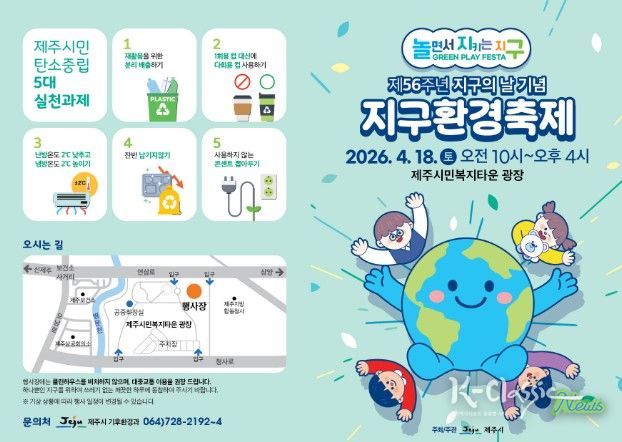 K-Classic News 기자 | 제주시는 제56주년 지구의 날을 기념해 4월 18일 제주시민복지타운 광장에서 시민들이 즐겁게 참여하고 소통할 수 있는 ‘2026 지구환경축제’를 개최한다.