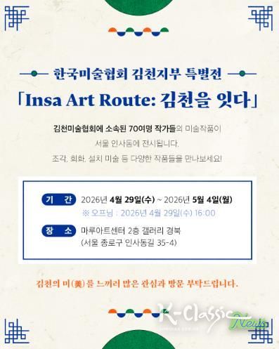 K-Classic News 기자 | 김천시는 4월 29일부터 5월 4일까지 6일간 서울 마루아트센터 2층 갤러리 경북에서 한국미술협회 김천지부 특별전 ‘인사 아트 루트(Insa Art Route): 김천을 잇다’를 개최한다고 밝혔다.