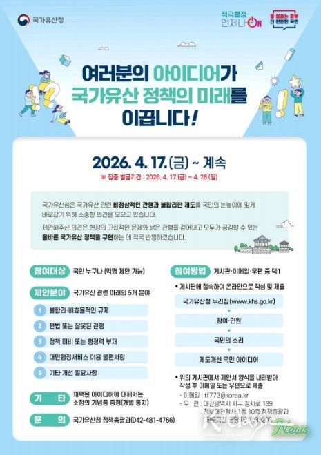 K-Classic News 기자 | 국가유산청은 국가유산 관련 비정상적인 관행과 불합리한 제도를 바로잡기 위한 정상화 과제를 발굴하고자 17일부터 국민들의 참신한 아이디어를 받는다.