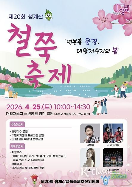 K-Classic News 기자 | 성남시는 ‘제20회 철쭉 축제’가 오는 4월 25일 오전 10시~오후 2시 30분 수정구 상적동 대왕저수지 수변공원 광장에서 열린다고 21일 밝혔다.