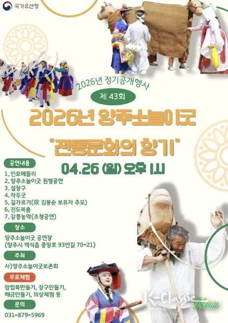 K-Classic News 기자 | 양주시는 국가유산청의 지원을 받아 ‘제43회 양주소놀이굿 정기공개행사’를 오는 26일 오후 1시, 양주소놀이굿 전수교육관 공연장에서 개최한다고 밝혔다.