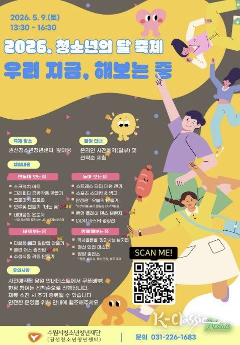 K-Classic News 기자 | 수원시청소년청년재단 권선청소년청년센터가 오는 5월 9일, 청소년이 주인공이 되어 직접 경험하고 도전하는 참여형 축제 ‘지금우리, 해보는중’을 개최한다고 밝혔다.