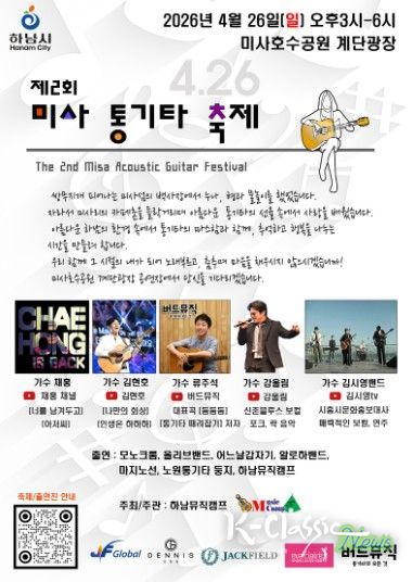 K-Classic News 기자 | 하남시 지역 예술인들이 참여하는 '제2회 미사통기타축제'가 오는 4월 26일 오후 3시부터 미사호수공원 계단광장에서 개최된다.
