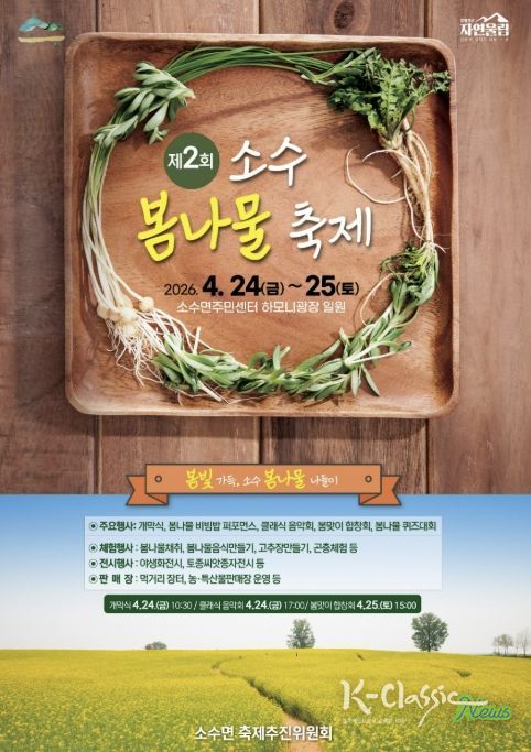 K-Classic News 기자 | 충북 괴산군 소수면축제추진위원회는 오는 24일부터 25일까지 이틀간 소수면 하모니광장 일원에서 ‘제2회 소수봄나물축제’를 연다.