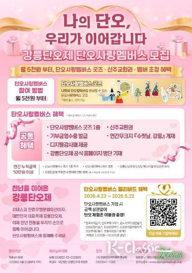 K-Classic News 기자 | (사)강릉단오제위원회는 천년의 전통을 이어온 강릉단오제의 지속가능한 운영과 시민 참여를 위해 ‘단오사랑멤버스’를 모집한다고 밝혔다.
