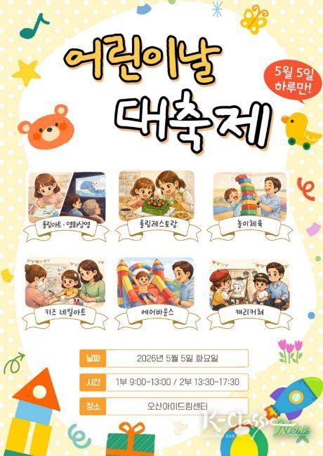 K-Classic News 기자 | 오산시가 운영하는 오산아이드림센터가 어린이날을 맞아 온 가족이 함께 즐길 수 있는 특별 체험행사를 마련한다.