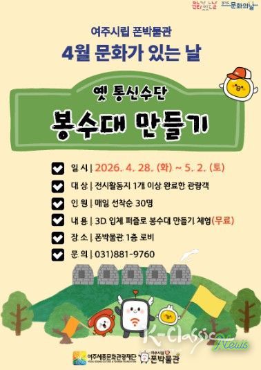 K-Classic News 기자 | 여주세종문화관광재단이 운영하는 여주시립 폰박물관은 4월 '문화가 있는 날'을 맞아 오는 4월 28일부터 5월 2일까지 시민 참여형 체험 행사 '소식을 전하던 봉수대 만들기'를 운영한다.