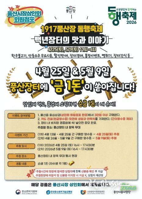 안동시 관계자는 “1917년부터 지역 경제의 중심 역할을 해온 풍산시장의 매력을 널리 알리고자 이번 축제를 기획했다”며, “맛있는 먹거리와 즐거운 쇼핑, 그리고 순금의 행운까지 함께하는 풍산장터에서 백년 장터의 깊은 맛과 이야기를 만끽하시길 바란다”고 전했다.