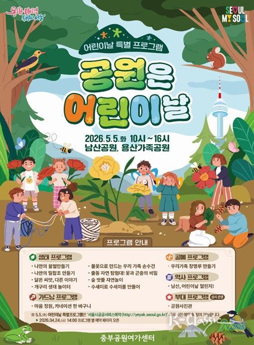 K-Classic News 기자 | 서울시 중부공원여가센터는 5월 5일 어린이날을 맞아 ‘남산하늘숲길’ 개방 이후 산책 명소로 많은 사랑을 받고 있는 남산공원과, 푸르른 잔디가 펼쳐진 용산가족공원에서 온 가족이 함께 즐길 수 있는 특별프로그램 '공원은 어린이날'을 운영한다고 밝혔다.