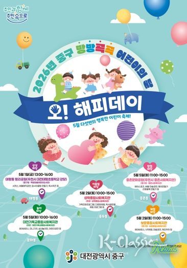 K-Classic News 기자 | 대전 중구가 다가오는 5월 1일부터 5일까지 '2026년 중구 방방곡곡 어린이의 달 오! 해피데이' 어린이달 축제를 개최한다고 밝혔다.