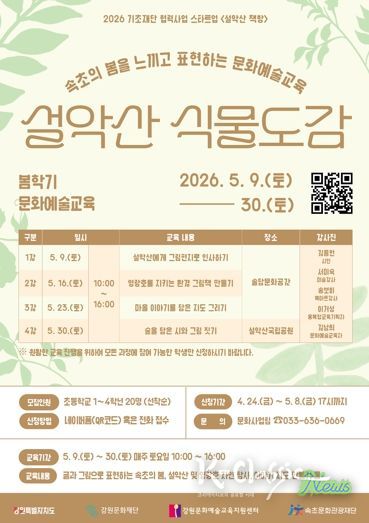 ‘설악산 식물도감’은 초등학생 1~4학년을 대상으로 봄학기와 가을학기로 나눠 운영한다. 봄학기는 5월 9일부터 30일까지 총 4회 진행되며, 설악산과 영랑호 일대 자연 탐사를 통해 계절의 변화를 관찰하고 이를 글과 그림으로 표현하는 창작 활동으로 꾸며진다. 주요 프로그램은 ‘설악산에게 그림편지로 인사하기’, ‘숲을 담은 시와 그림 짓기’ 등이며, 지역에서 활발히 활동하는 전문 강사들이 교육에 참여한다.