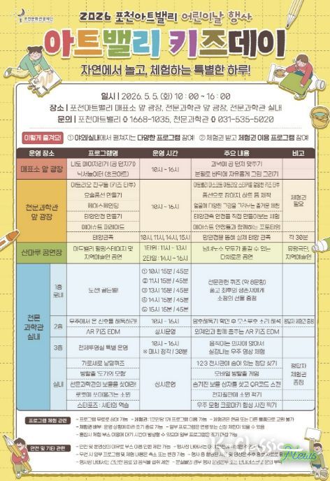 K-Classic News 기자 | 포천문화관광재단이 운영하는 포천아트밸리는 오는 5월 5일 어린이날을 맞아 어린이와 가족을 위한 체험형 문화행사 ‘아트밸리 키즈데이’를 개최한다.