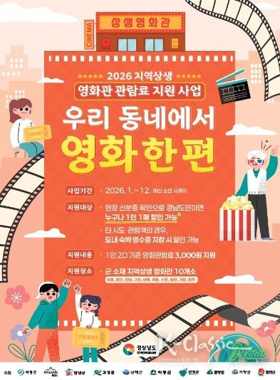 K-Classic News 기자 | 거창군은 다가오는 5월 가정의 달을 맞이해 군민들의 문화 향유 기회를 확대하고 지역 영화관의 활성화를 돕기 위해 ‘2026년 지역상생 영화관 관람료 지원사업’을 시행한다.