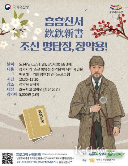 K-Classic News 기자 | 남양주시는 오는 5월 24일과 31일, 6월 14일 정약용 유적지에서 초등학교 고학년을 대상으로 참여형 연극 프로그램 ‘흠흠신서: 조선 명탐정, 정약용!’ 참가자를 모집한다고 밝혔다.