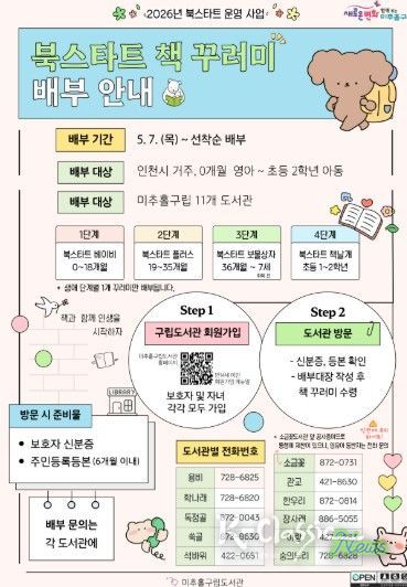 아울러 미추홀 구립도서관은 책 꾸러미 배부와 연계한 ‘북 스타트 책놀이 프로그램’도 운영한다. 용비·학나래·석바위·이랑도서관 4개 관에서 매주 목요일 오전 11시부터 12시까지 ‘북 스타트 책놀이 프로그램’이 진행되며, 자세한 일정과 참여 방법은 각 도서관 누리집 공지 사항을 통해 확인할 수 있다.