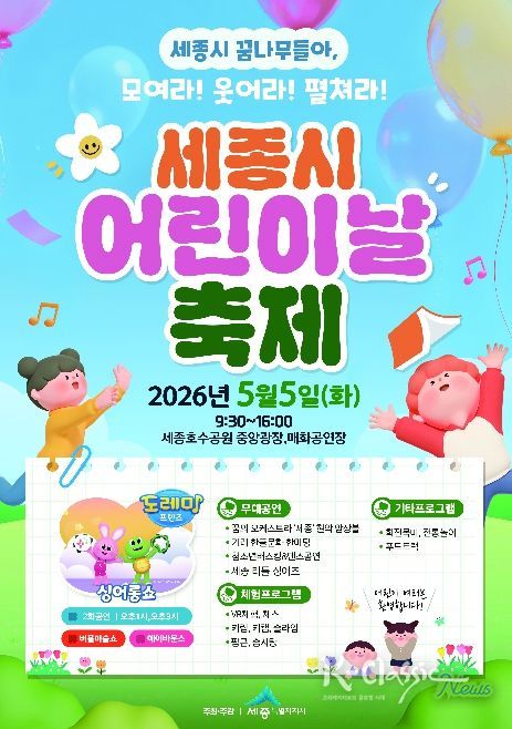 K-Classic News 기자 | 세종특별자치시가 오는 5월 5일 어린이날 세종호수공원 일원에서 ‘제104회 세종 어린이날 행사’를 개최한다.